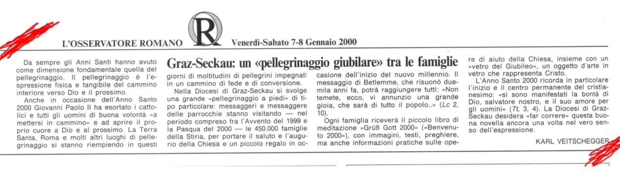 il popolo.." (Lc 2,10). Ogni famiglia riceverà il piccolo libro di meditazione "Grüß Gott 2000" ("Benvenuto 2000"), con immagini, testi, preghiere, ma anche informazioni pratiche sulle opere di aiuto della Chiesa, insieme con un "vetro del Giubileo", un oggetto d'arte in vetro che rappresenta Cristo. L'Anno Santo 2000 ricorda in particolare l'inizio e il centro permanente del cristianesimo: "si sono manifestati la bontà di Dio, salvatore nostro, e il suo